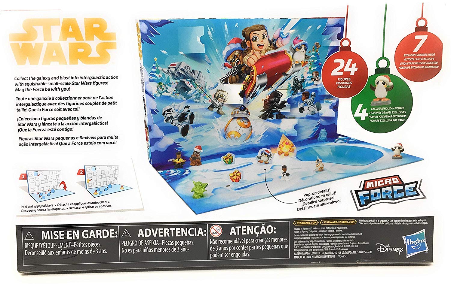 Jedi Knights, Sith Lords, Stormtroopers, X-wings, Star destroyers, AT-AT walkers, droids, Wookiees, Rebel heroes, and more! Imagine big Star Wars adventures at a small scale with Star Wars micro force!star Wars micro force figures are expressive, small-scale figures from the Star Wars universe! Kids can start or add to their micro force collection with the Star Wars Micro force Advent calendar, including 24 figures and 7 exclusive stickers from a galaxy far, far away! Look for the holiday-themed figures and translucent figures! Calendar includes 24 openable windows so that for each day of the countdown, kids can discover 1 unique micro force figure. Package also folds down to reveal a Star Wars backdrop, so kids can apply stickers and play with figures on a star Wars-inspired scene!blast into intergalactic action with squishable small-scale figures from Star Wars Micro force! May the force be with you!star Wars products are produced by Hasbro under license from Lucasfilm Ltd. Hasbro and all related terms are trademarks of Hasbro.