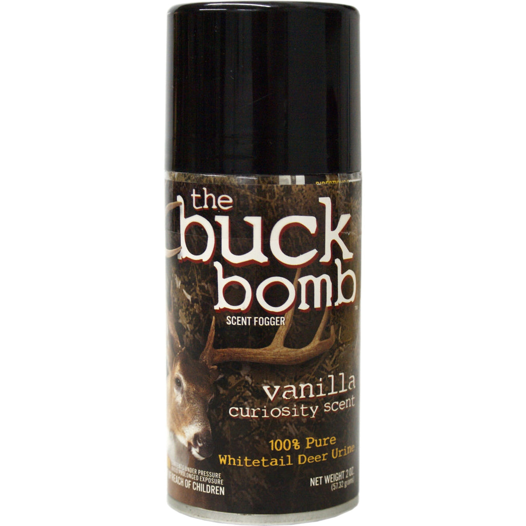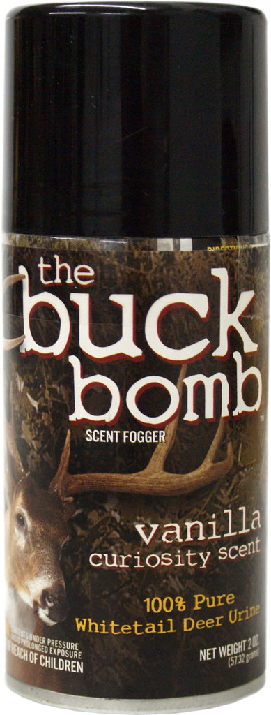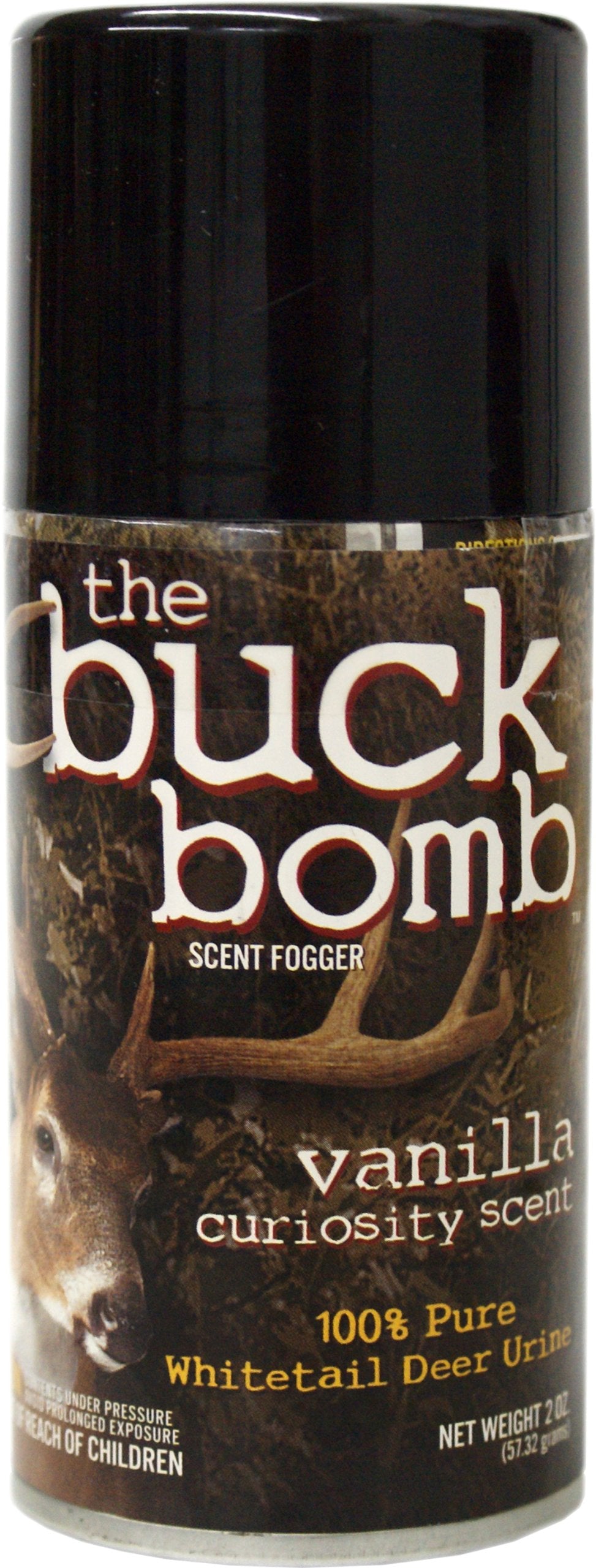100% Vanilla Curiosity Scent in an aerosol fogger that can be sprayed intermittently or locked down to fog out the entire contents. With a 3 mph breeze this scent will travel a ¼ mile attaching itself to leaves, trees, brush, etc. leaving a natural scent trail right back to The Buck Bomb can. Unequaled coverage and broadcast area, covers the hunters down wind side. Works excellent at establishing bait sites. Great all season scent. The most effective way to get scent to the deer's nose.