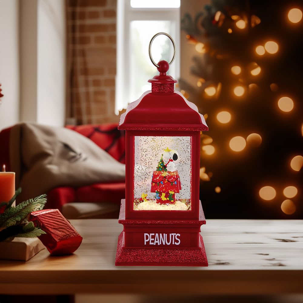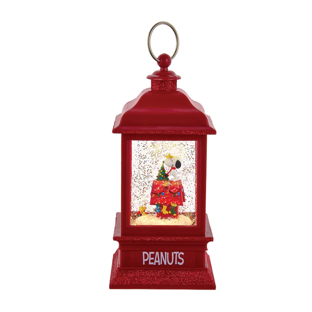 This 9-Inch Battery-Operated Peanuts Lit Musical Water Lantern from Kurt Adler is a fun and festive addition to any holiday décor. It features Snoopy sitting atop his decorated red dog house with Woodstock watching him closely. When activated, this lantern plays music and the swirling glitter design gives the scene a snowy effect. This item requires 3 AA batteries (not included).