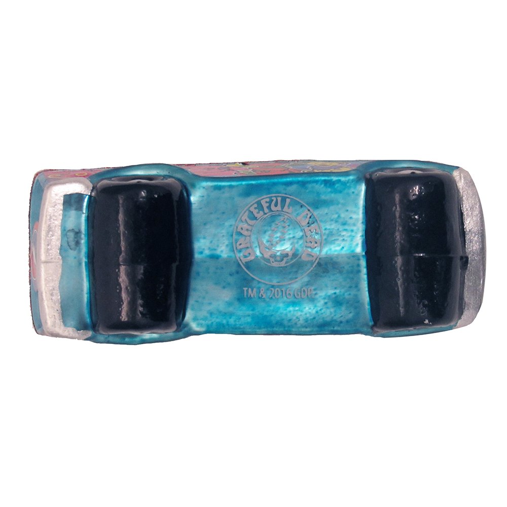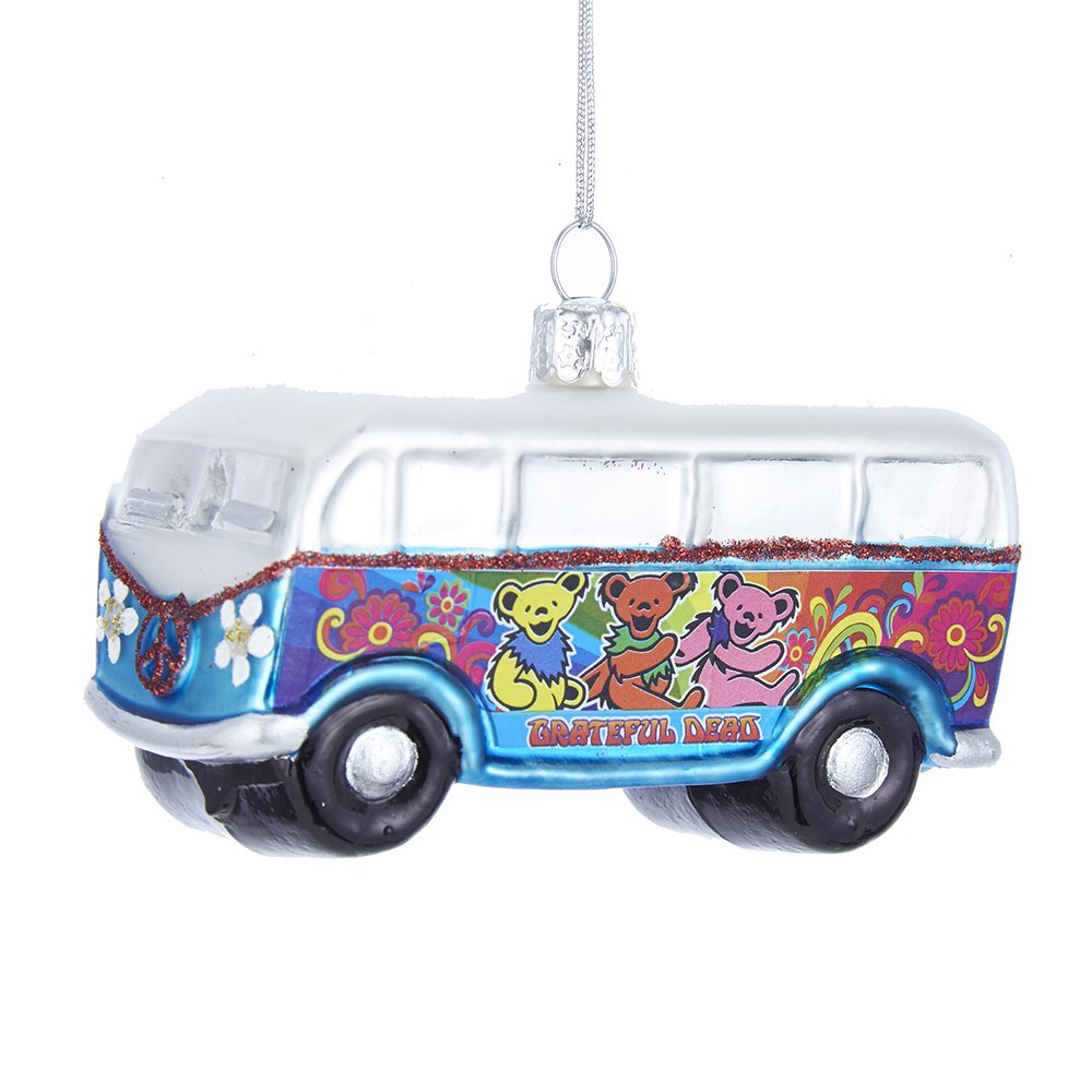 Add to your groovy deadhead holiday decor with this 4-inch glass grateful dead ornament from Kurt Adler. its design is modeled after a 1960s style bus that has been decorated with a colorful pattern of grateful dead bears and flowers.
