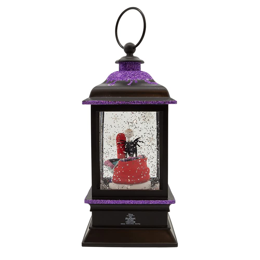 This 9-Inch Battery-Operated Disney© Nightmare Before Christmas Jack and Sally Spinning Musical Light-Up Lantern from Kurt Adler is a fun and festive addition to any holiday décor. It features Jack Skellington and Sally sitting on a toy sack surrounded by decorated presents. When activated, this lantern is illuminated with one warm white LED light and plays music and the swirling glitter design gives the scene a snowy effect. Requires 3 AA batteries, not included.